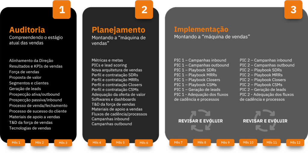 | Desenvolvimento | Consolidação da Metodologia de Receita Previsível | Aprendizado, ajustes e consolidação da estrutura, pessoas, processos, tecnologias e controles para otimização dos resultados com a metodologia de Receita Previsível® |